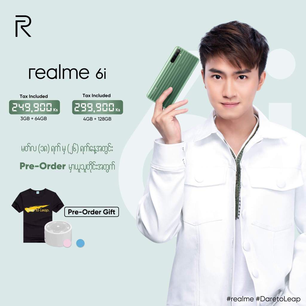 The Realme 6i comes in White Milk and Green Tea colors, is priced at 2,49,990 Myanmar Kyat (US$ 177 / Rs. 13,100 approx.) for the 3GB RAM with 64GB storage version and the 4GB RAM with 128GB storage version costs 2,99,990 Myanmar Kyat (US$ 212 / Rs. 15,720 approx.). It will be available for pre-order starting tomorrow, March 18th till March 26th and will go on sale in Myanmar starting from March 29th. All the pre-orders will get a free realme t-shirt and a Bluetooth speaker.